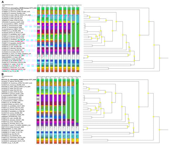 Species delimitation analyses of cox1 sequences of Eresidae species. The name of the novel species, Eresus rubrocephalus sp. n., is highlighted in bold. Panel (A): ASAP analysis with the Jukes–Cantor (JC69) substitution model. Panel (B): ASAP analysis with the Kimura-2P (K80) substitution model.