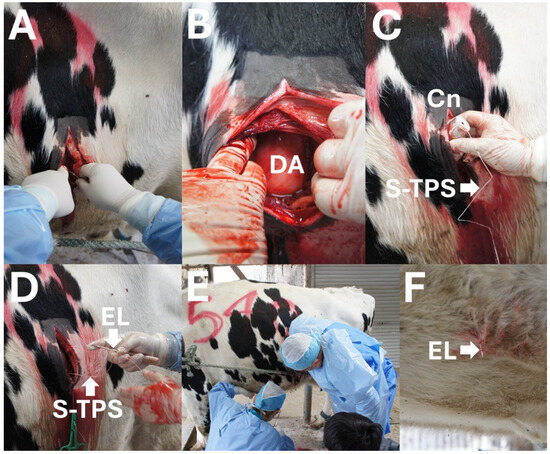 sTPS was performed with the animal in the standing position and sedated with an intramuscular injection of xylazine hydrochloride (0.05 mg/kg; Rompun; Elanco Japan, Minato-ku, Tokyo, Japan). The skin was shaved and disinfected at the ventral area of the left flank along the thirteenth rib and the midline area of the ventral abdomen more cranially than the mammary gland. Local anesthesia was induced by percutaneous injection of procaine hydrochloride (30 mL; Adsan; Riken Vets Pharma Inc., Ogose-cho, Saitama, Japan) diffused within the surgical areas, as infiltration anesthesia.