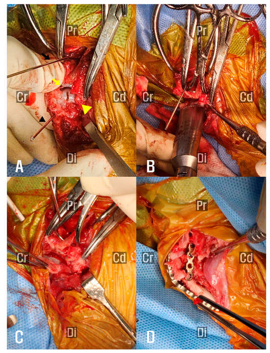 Figure 4B,C), to allow controlled adjustment of the limb alignment angle. The joint was then stabilized at an angle of approximately 120°, a position considered appropriate for maintaining functional limb posture during ambulation. Internal fixation was achieved using a combination of a K-wire and two contoured reconstruction locking plates. A single 1.6 mm K-wire was inserted from the greater tubercle of the humerus into the scapular body to maintain the reduction of the osteotomy surfaces and augment stabilization of the bones across the fusion site. Subsequently, internal fixation was completed with anatomically contoured locking plates. A 1.5 mm/2.0 mm poly-axial locking plate (Arix Vet, Jeil Medical Corp., Seoul, Republic of Korea) was contoured and applied to the craniolateral aspect of the scapula and proximal humerus, with screws directed to engage both the scapular spine and body. An additional 1.2 mm locking plate (Arix 1.2; Arix vet, Jeil Medical Corp.) was contoured and applied to the caudolateral aspect of the humerus to augment construct rigidity (