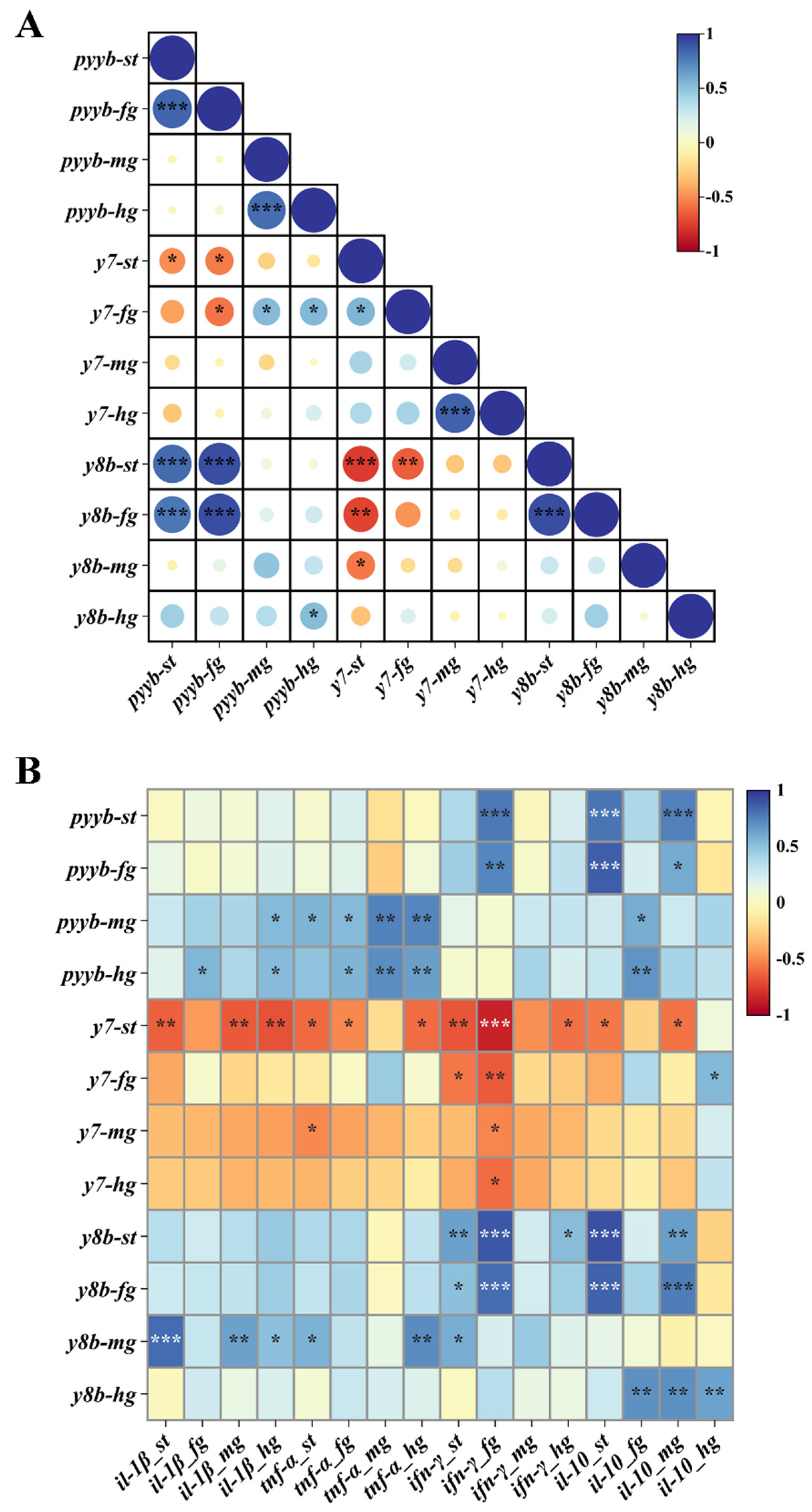 3.3. Correlation Analysis of PYY, Receptors and Inflammatory Factors in the Gastrointestinal Tract