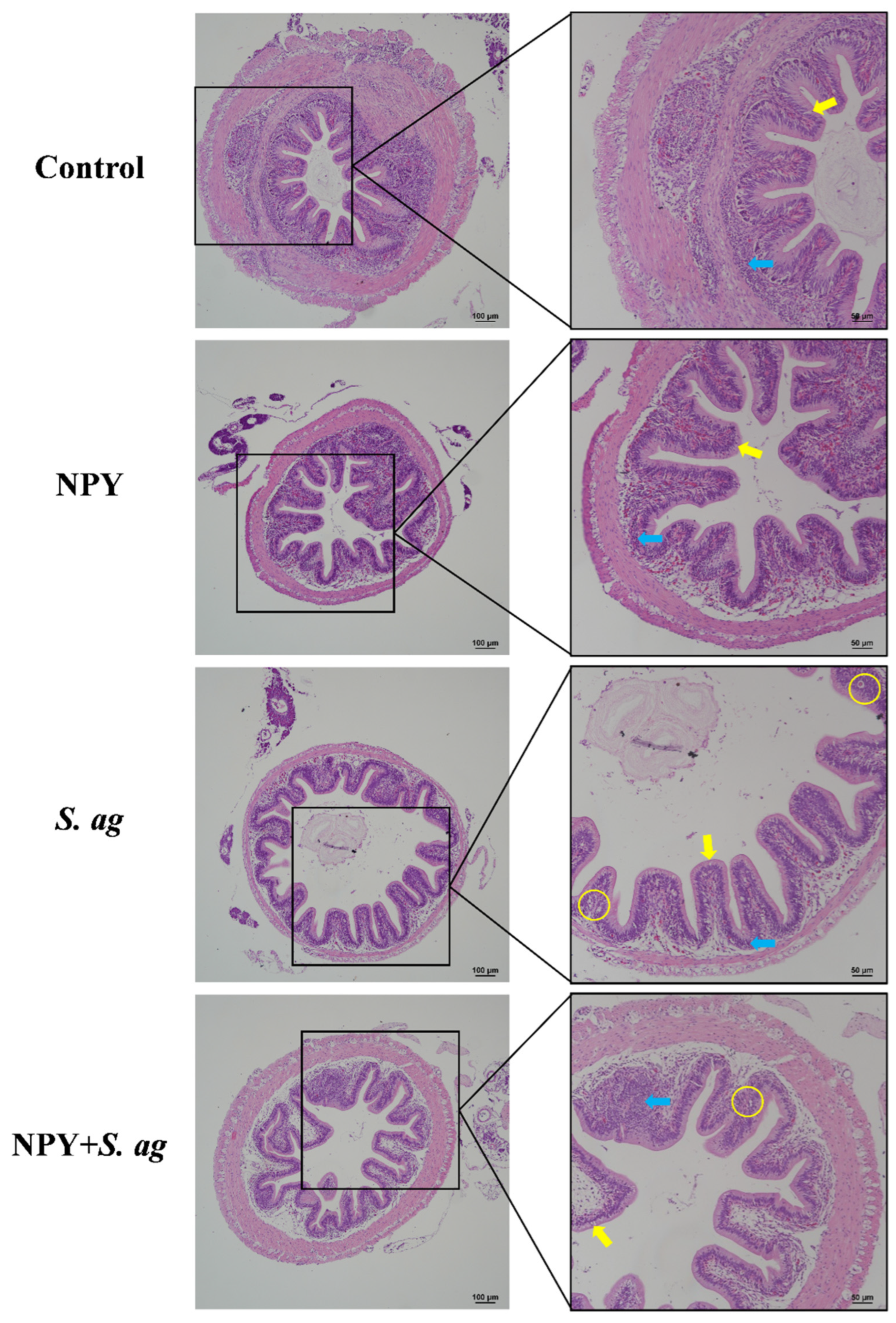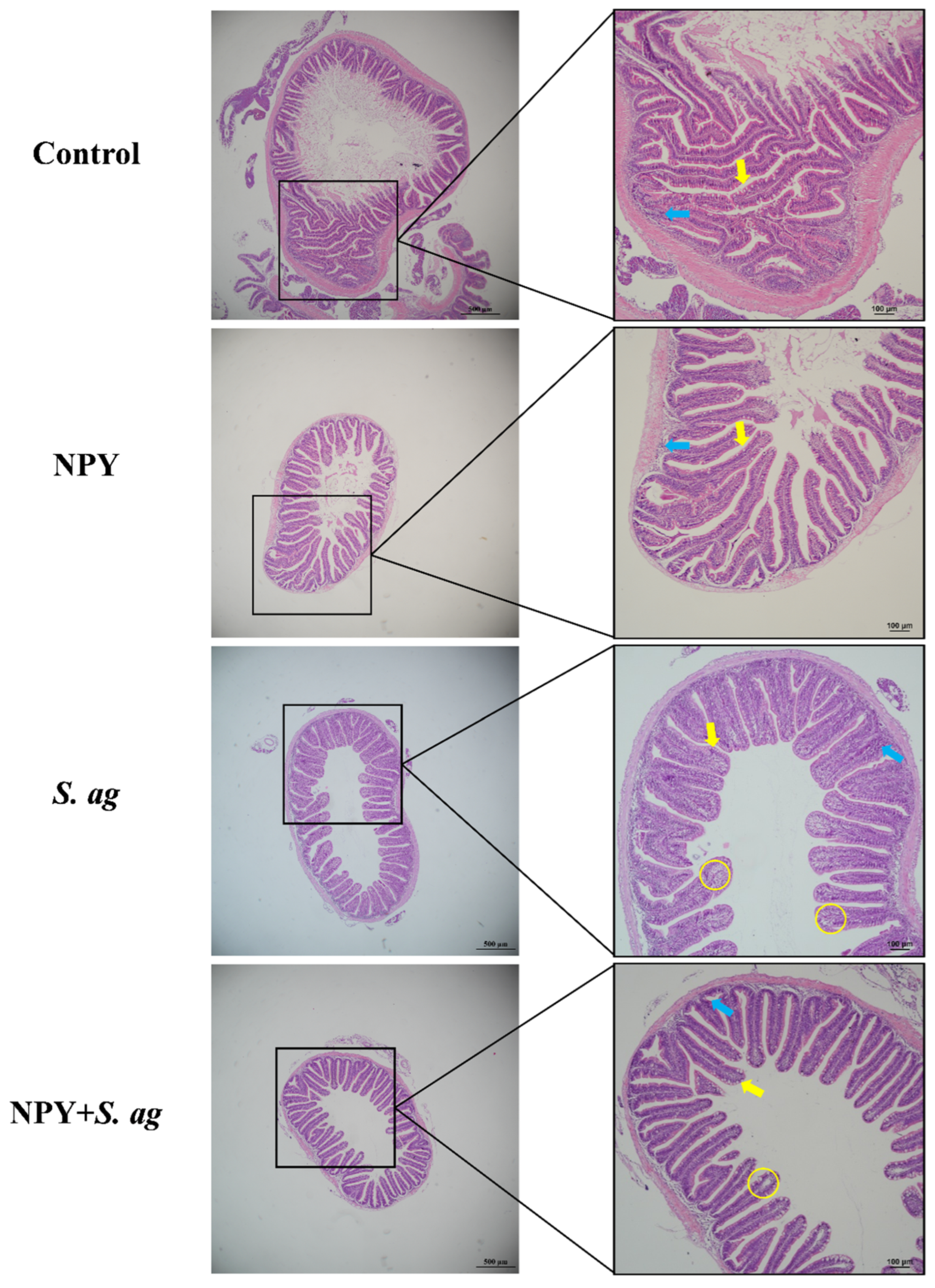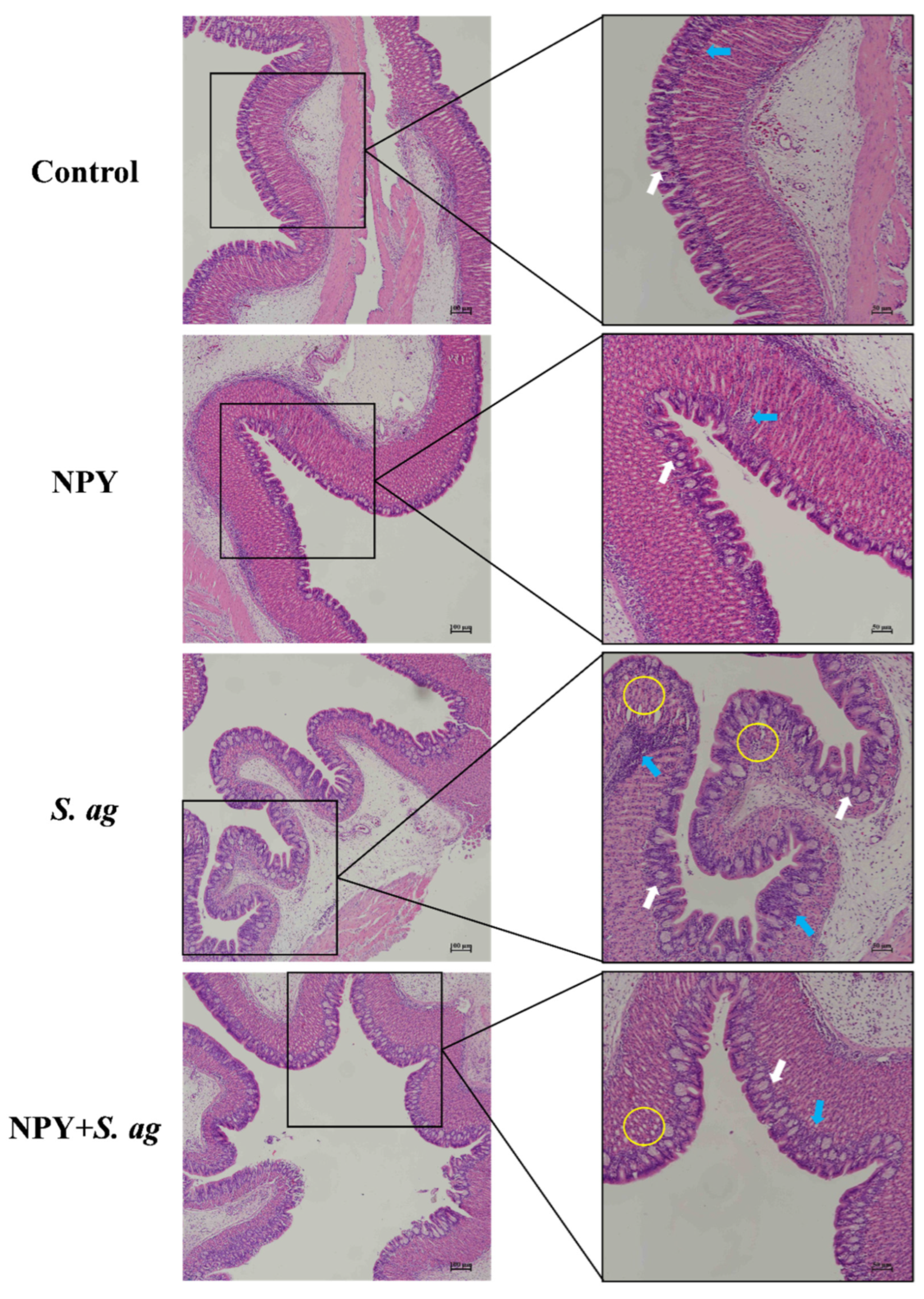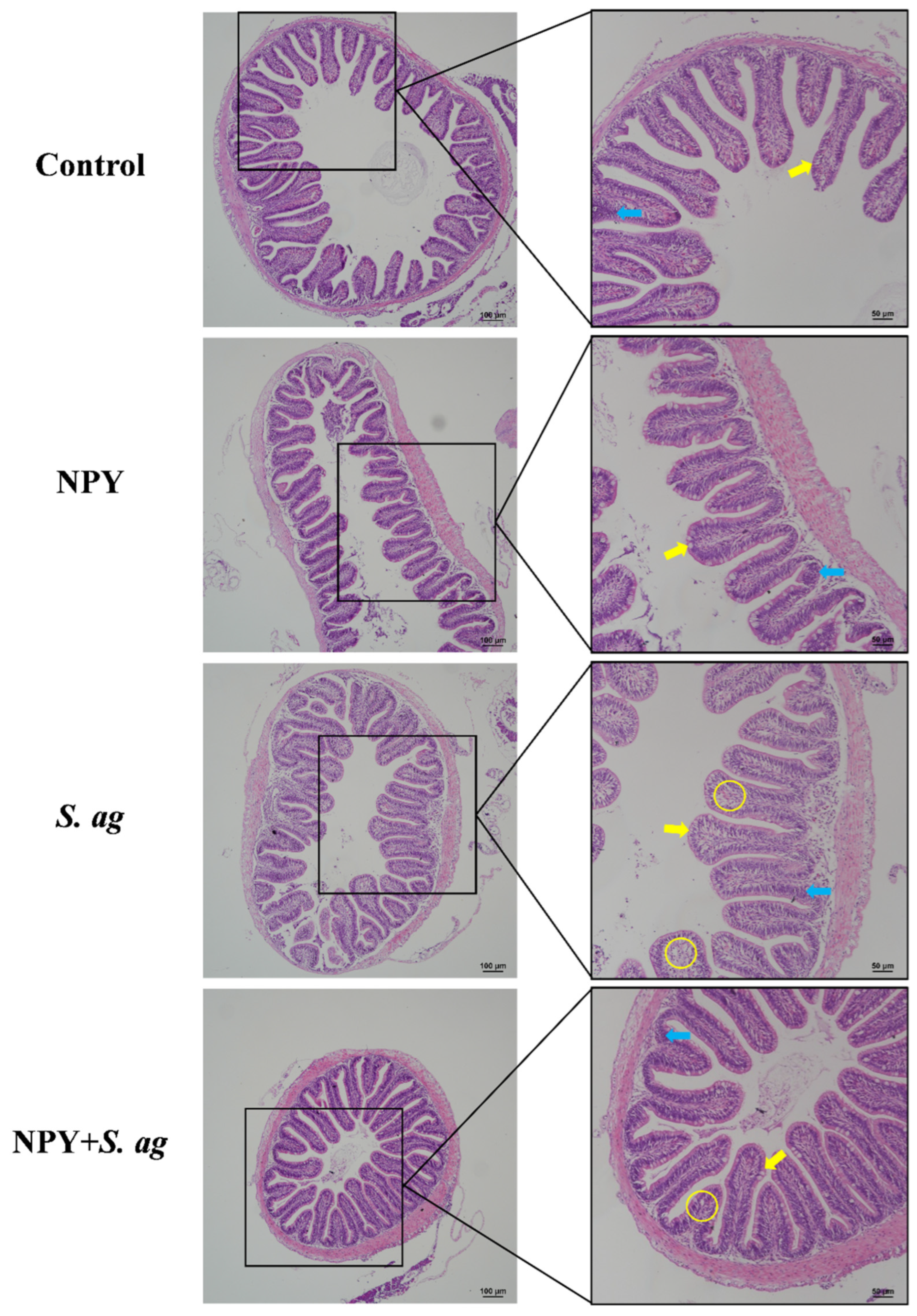 3.4. NPY Ameliorated Gastrointestinal Tissue Damage in Tilapia Caused by S. agalactiae
