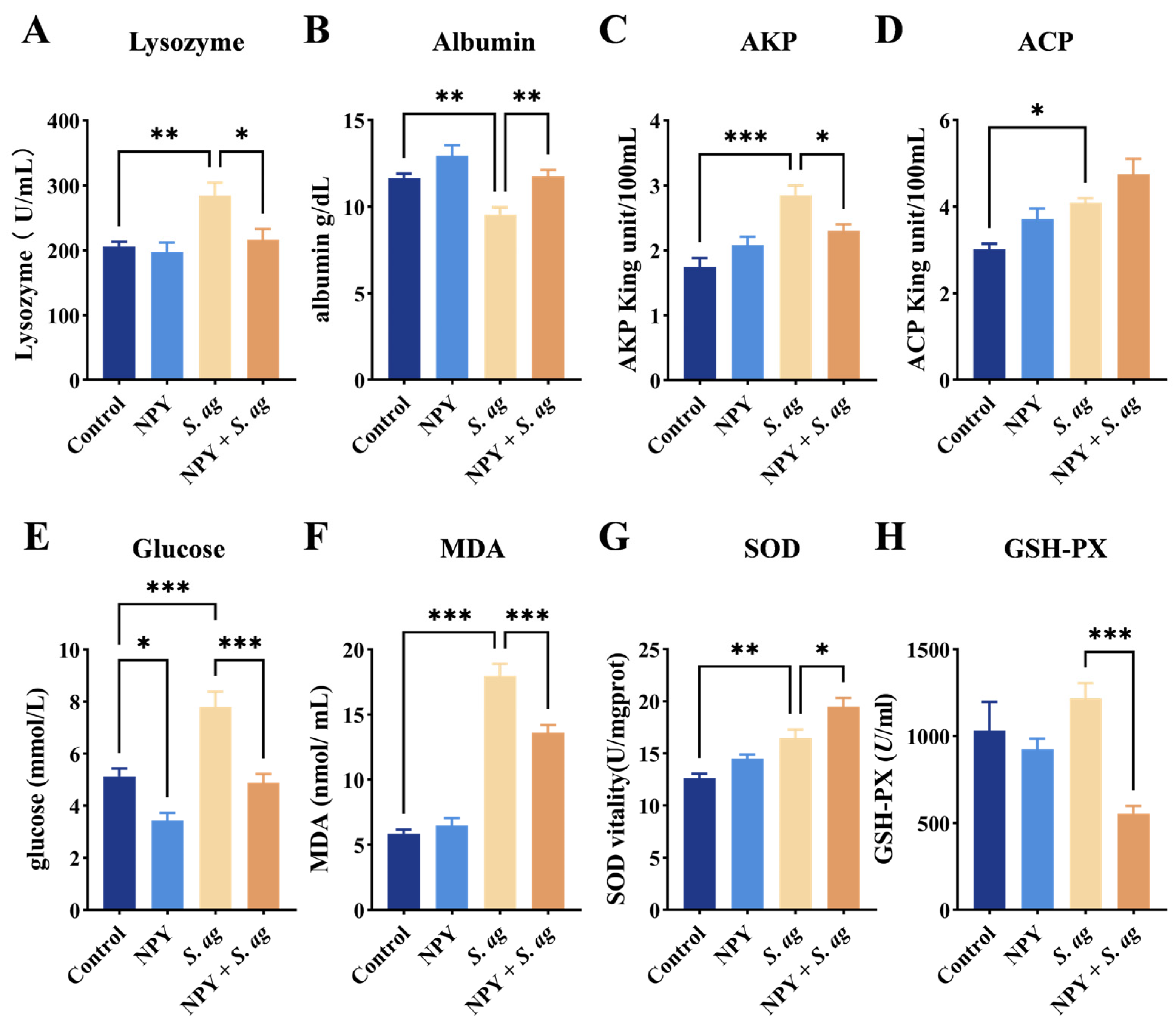 Yu, Y.; Liu, Z.; Zhou, M.; Chen, Z.; Cai, R.; Song, C.; Li, M.; Zhu, T.; Sun, C.; Li, W. Neuropeptide Y Boosts Intestinal Mucosal Immunity of Tilapia Infected with Streptococcus agalactiae by Reducing Inflammation and Oxidative Stress. Animals 2025, 15, 2730. https://doi.org/10.3390/ani15182730