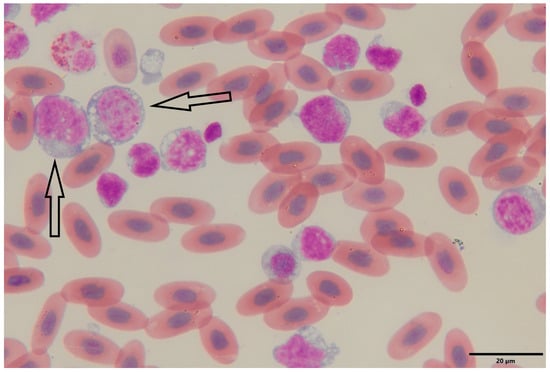 On the 26 January 2024, the bearded dragon was again anorexic. The animal was 3.3 years old and weighed 480 g at that time. The physical examination revealed a moderate body condition. Blood samples were collected for hematological and biochemical analysis in a 1.3 mL lithium heparin tube from the ventral tail vein. The hematological analysis showed an erythrocyte count of 0.9 × 106/µL, a hematocrit of 38%, a hemoglobin concentration of 9.9 g/dL, MCV of 422.2 fL, MCH of 110 pg, and MCHC of 26.1 g/dL. Blood smear evaluation revealed a predominance of immature lymphoid cells with blast morphology, findings consistent with lymphoblastic L/L, although definitive classification requires immunophenotypic and clinical correlation (Figure 1). A total and differential leukocyte count could not be performed due to the overwhelming presence of the blast population. Biochemical analysis showed elevated liver enzymes (ALT 60 U/L, AST 272 U/L) and hyperproteinemia (88 g/L). The diagnosis of L/L was suspected, and immunocytochemical or immunophenotypic confirmation was recommended. Therapy was initiated with methylprednisolone 1 mg/kg PO q24h (2 mg tablets, Pfizer PFE GmbH, Berlin, Germany), marbofloxacin 10 mg/kg IM q24h for 10 days (20 mg/mL, Vetoquinol, Lure, France), fluid replacement with Ringer’s solution (B. Braun, Melsungen, Germany) and Duphalyte® (Zoetis, Louvain-la-Neuve, Belgium) in a 4:1 ratio, 15 mL/kg SC, and 2 weeks later with lomustine 80 mg/m2 PO q14d (40 mg capsules, medac GmbH, Wedel, Germany) calculated according to published reptile-specific body surface area formulas [26].