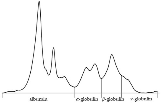 On the 5 February, the owner reported increased respiratory effort and mild ocular discharge. On the 7 February, the lizard’s dyspnea worsened, characterized by distension of the gular pouch during respiration, persistent anorexia, and obstipation. On the 10 February, the animal presented for administration of lomustine, marbofloxacin, and methylprednisolone. Despite persistent respiratory effort, the animal remained in good body condition and gained weight (486 g). Hematological analysis confirmed similar results as before (Table 1). Serum protein electrophoresis showed hyperalbuminemia (54%), increased alpha-globulins (20.3%), and decreased gamma-globulins (6.5%) (Figure 2). On the 13 February, a temporary improvement was observed, but the condition worsened acutely the next day. On the 14 February, darkening of the gular pouch and ventral body wall, accompanied by vomiting, diarrhea, and nervous behavior, was noted. The animal died spontaneously later that evening.