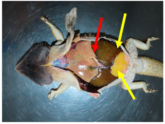 In situ post-mortem presentation of a bearded dragon (Pogona vitticeps), showing a markedly enlarged and pale liver (red arrow), prominent paired abdominal fat bodies (yellow arrows), and dark-brown to black discoloration of the skin of the ventral head.