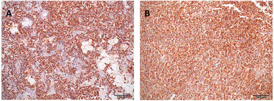 Lymphoid neoplasms are increasingly recognized in reptiles, including bearded dragons, and are often associated with non-specific hematological abnormalities that may also indicate inflammation [27,28]. Although both leukemia and lymphoma have been reported sporadically in this species, their clinical course, histopathological features, and immunophenotypic profiles differ considerably. By definition, leukemia involves neoplastic round cells in the bone marrow or peripheral blood, whereas lymphoma is characterized by their presence in solid tissues; in cases where the primary site cannot be determined, as in the present case, the appropriate designation is lymphoma/leukemia. Various laboratory methods have been used to phenotype neoplastic hematopoietic cells and distinguish lymphomas from leukemias [1,3,4,5,10,29,30,31,32].