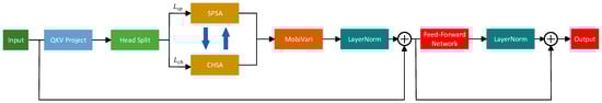 The multi-head self-attention mechanism (MHSA) [27] first applies three independent linear projections to the input features to generate the query (Q), key (K), and value (V) vectors. Each attention head computes attention weights based on its own Q and K, which are then used to perform a weighted aggregation of the values across all positions, capturing contextual information of different semantic relationships. After parallel processing by multiple heads, their outputs are concatenated and fused through a linear transformation to produce new feature representations that encode global dependencies. This enhances the model’s ability to capture relationships between distant and local keypoints. The architecture of the MHSA module is illustrated in Figure 3.