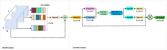 After integrating the SimAM module into the backbone, the model’s perception of keypoint regions was notably enhanced, leading to improved localization accuracy. However, SimAM primarily focuses on pixel-level point-wise attention and lacks the ability to model spatial relationships and structural dependencies between keypoints. To further enhance the model’s awareness of spatial arrangements and fully exploit the complementary advantages of different attention mechanisms in keypoint modeling, we propose a novel attention module named CASimAM, which combines SimAM with Coordinate Attention. Specifically, the SimAM module first models pixel-level saliency within each channel, thereby enhancing the response to key regions in the feature map. Subsequently, the Coordinate Attention module [29,30] further explores spatial structural information through a decomposed coordinate attention mechanism. By encoding horizontal and vertical positional dependencies separately, Coordinate Attention enables the model to capture richer spatial structural relationships between keypoints. The two attention mechanisms complement each other: SimAM focuses on local saliency enhancement, while Coordinate Attention strengthens spatial orientation perception. Together, they significantly improve the model’s keypoint localization accuracy and structural understanding of cattle anatomy. The structure of CASimAM is illustrated in Figure 4.