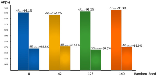To further evaluate the stability and robustness of the proposed model, we trained YOLOv8-DMC-pose under different random seeds (default, 42, 123, 140). As shown in Figure 7, the results (0.928–0.933) and results (0.866–0.871) remained highly consistent across runs, with variations within ±0.003, demonstrating reliable convergence and robustness of the model under different initialization settings. Instead of reporting per-keypoint AP, we follow standard pose estimation practices and adopt the overall mAP as a summary indicator, as it more directly reflects the end-to-end performance required in practical deployment scenarios. In addition, inference was benchmarked on an edge device (NVIDIA Jetson Xavier NX, NVIDIA Corporation, Santa Clara, CA, USA), where YOLOv8-DMC-pose achieved 28.3 FPS (35.4 ms per frame), confirming its suitability for real-time applications in farm environments.