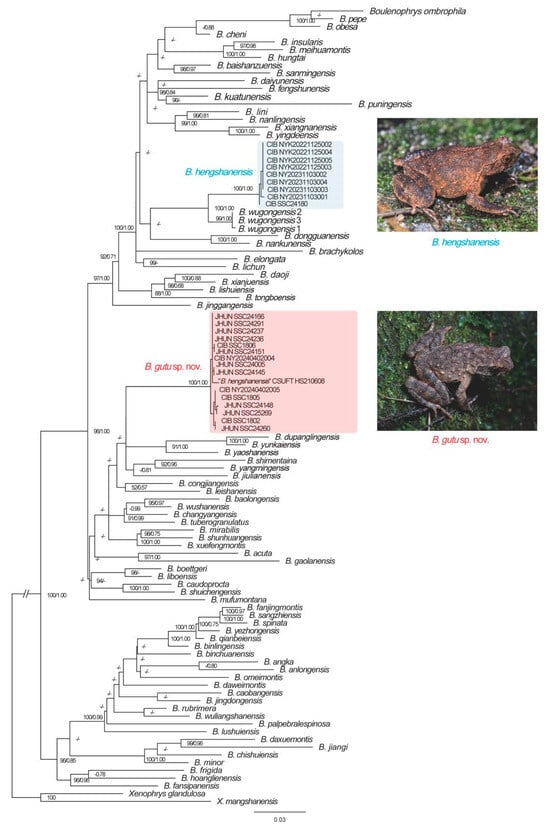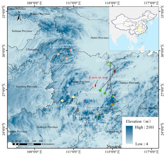 The number of Boulenophrys species in Hunan Province, China, has now reached 19: B. caudoprocta, B. cheni, B. dupanglingensis, B. gutu sp. nov., B. hengshanensis, B. jinggangensis, B. lini, B. mufumontana, B. nanlingensis, B. ombrophila, B. sangzhiensis, B. shimentaina, B. shunhuangensis, B. tuberogranulata, B. wugongensis, B. xiangnanensis, B. xuefengmontis, B. yangmingensis and B. jiulianensis (Figure 1) [,,]. Most of these species were described recently. This indicates further research on the diversity of this group in Hunan Province could reveal more new findings.