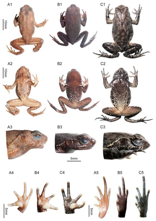 Morphological comparison between adult males of Boulenophrys hengshanensis and B. gutu sp. nov. (A) holotype of B. hengshanensis HUNL 0706000A; (B) topotype of B. hengshanensis CIB NYK20221125003; (C) holotype of B. gutu sp. nov. CIB NY20240402004; (1) dorsal body; (2) ventral body; (3) lateral head; (4) ventral hand; (5) ventral feet.