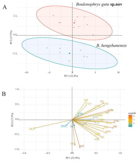 Plots (A) and loading diagram (B) of the first principal component (PC1) versus the second (PC2) for adult males of Boulenophrys hengshanensis and B. gutu sp. nov.