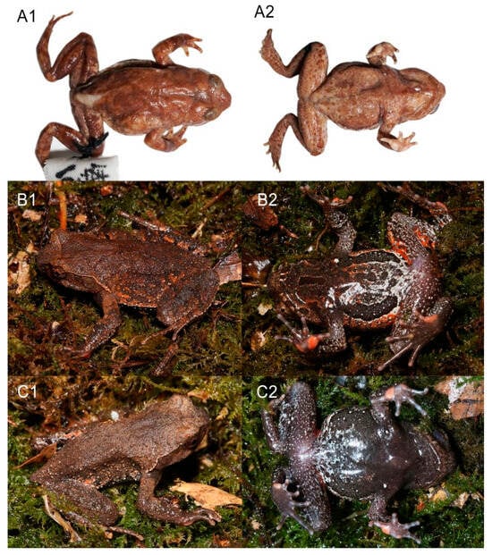 Paratype and topotypes of Boulenophrys hengshanensis. (A) female paratype HUNL 1997:6–17; (B) male topotype CIB NYK20221125005; (C) male topotype CIB NY20221125003; (1) dorsal or dorsolateral view of body; (2) ventral view of body.