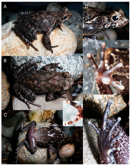 Holotype of Boulenophrys gutu sp. nov. CIB NY20240402004 in life. (A) dorsolateral body; (B) dorsal body; (C) ventral body; (D) lateral head; (E) ventral hand; (F) ventral feet; (G) nuptial pads on inner two fingers.