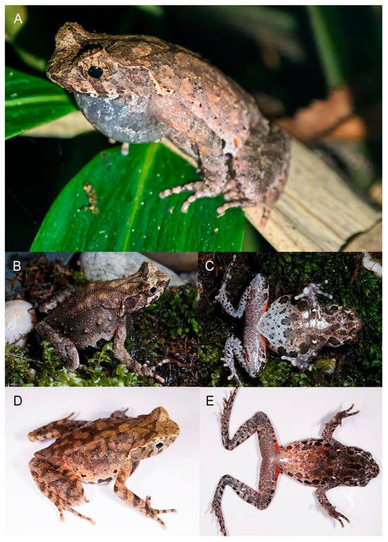 Paratypes of Boulenophrys gutu sp. nov. in life. (A) male paratype JHUN SSC24148 calling on a bamboo leaf; (B,C) dorsolateral and ventral view of female paratype CIB NY20240402005; (D,E) dorsolateral and ventral view of female paratype CIB SSC1804.