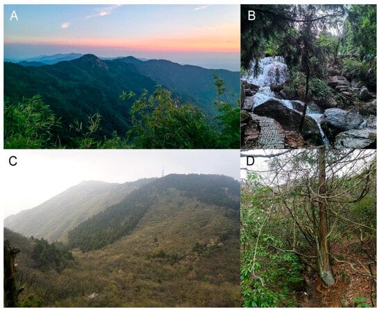 Habitats of Boulenophrys hengshanensis and B. gutu sp. nov. (A) landscape and forest of Mt. Hengshan; (B) the mountain stream at the site where the holotype of B. gutu sp. nov. was collected; (C) a moist bush valley near the top of Mt. Hengshan, where B. hengshanensis was found; (D) A small stream at Laotaiyi, where the female paratype of B. hengshanensis HUNL 1997:6–17 was collected.