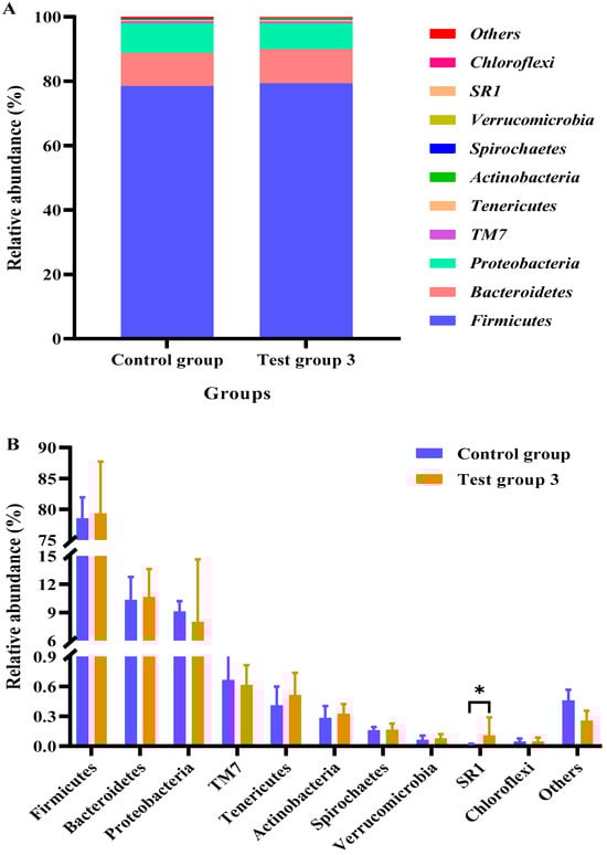 Figure 1 shows the ten most abundant microbial phyla. At the phylum level, the rumen bacterial community comprised Firmicutes, Bacteroidota, and Proteobacteria, which accounted for approximately 95% of the top 10 phyla. The abundances of these bacterial phyla were similar between the control group and test group 3 (p > 0.05). Compared with those in the control group, the relative abundances of Firmicutes, Bacteroidetes, Tenericutes, Actinobacteria, Spirochaetes, and Verrucomicrobia were higher, and the relative abundances of Proteobacteria, TM7, and Chloroflexi were lower in test group 3 (p < 0.05). The relative abundance of SR1 in test group 3 was higher than that in the control group (p < 0.05).