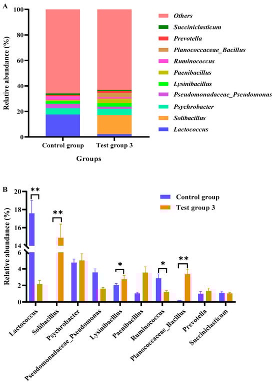 Figure 2 shows the top ten genera in the rumen fluid of Angus cattle. The rumen fluid abundances of Solibacillus, Lysinibacillus, and Planococcaceae_Bacillus in test group 3 were higher than those in the control group (p < 0.05). In contrast, the relative abundances of Lactococcus and Ruminococcus in test group 3 were lower than those in the control group (p < 0.05). Compared with those in the control group, the relative abundances of Paenibacillus and Prevotella were non-significantly higher, and the relative abundances of Pseudomonadaceae_Pseudomonas were non-significantly lower in test group 3 (p > 0.05).