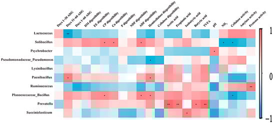 Pearson’s correlation coefficient analysis revealed that the abundances of the top 10 genera were closely associated with growth performance, apparent nutrient digestibility, and fermentation parameters (Figure 3). The abundance of Solibacillus was significantly and positively correlated with the apparent digestibility of CP, Ca, and ADF and negatively correlated with NH3-N and cellulase activity (p < 0.05). Meanwhile, the abundance of Paenibacillus was significantly and positively correlated with ADG on days 31–60 and apparent digestibility of hemicellulose (p < 0.05). Additionally, the abundance of Planococcaceae_Bacillus was significantly and positively correlated with the apparent digestibility of CP, ADF, and hemicellulose (p < 0.05) and negatively correlated with cellulase activity (p < 0.05). Prevotella abundance was significantly and positively correlated with acetate, propionate, butyrate, and TVFA levels (p < 0.05). Succiniclasticum abundance was significantly and positively correlated with isobutyric acid levels (p < 0.05).