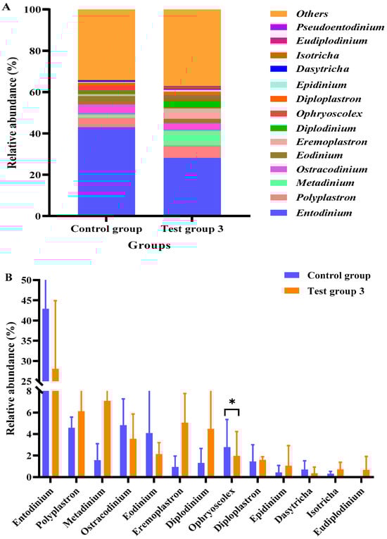 As shown in Figure 4, the relative abundance of Ophryoscolex in test group 3 was significantly lower than that in the control group (p < 0.05). Compared with those in the control group, the relative abundances of Polyplastron, Metadinium, Eremoplastron, Diplodinium, Epidinium, Isotricha, and Eudiplodinium were non-significantly higher, and the relative abundances of Entodinium, Ostracodinium, Eodinium, Diploplastron, and Dasytricha were non-significantly lower in test group 3 (p > 0.05).