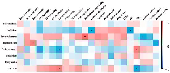 Correlation between rumen bacterial abundance and the growth, nutrient digestion, and fermentation characteristics of Angus cattle. Data of only significant correlations (r > 0.60 or r < −0.60 and p-value < 0.05) and bacteria with abundances > 0.5% are presented. Positive (coefficient close to 1) and negative (coefficient close to −1) correlations between the examined traits and bacterial abundances are indicated in red and blue colors, respectively. • p < 0.05; •• p < 0.01.