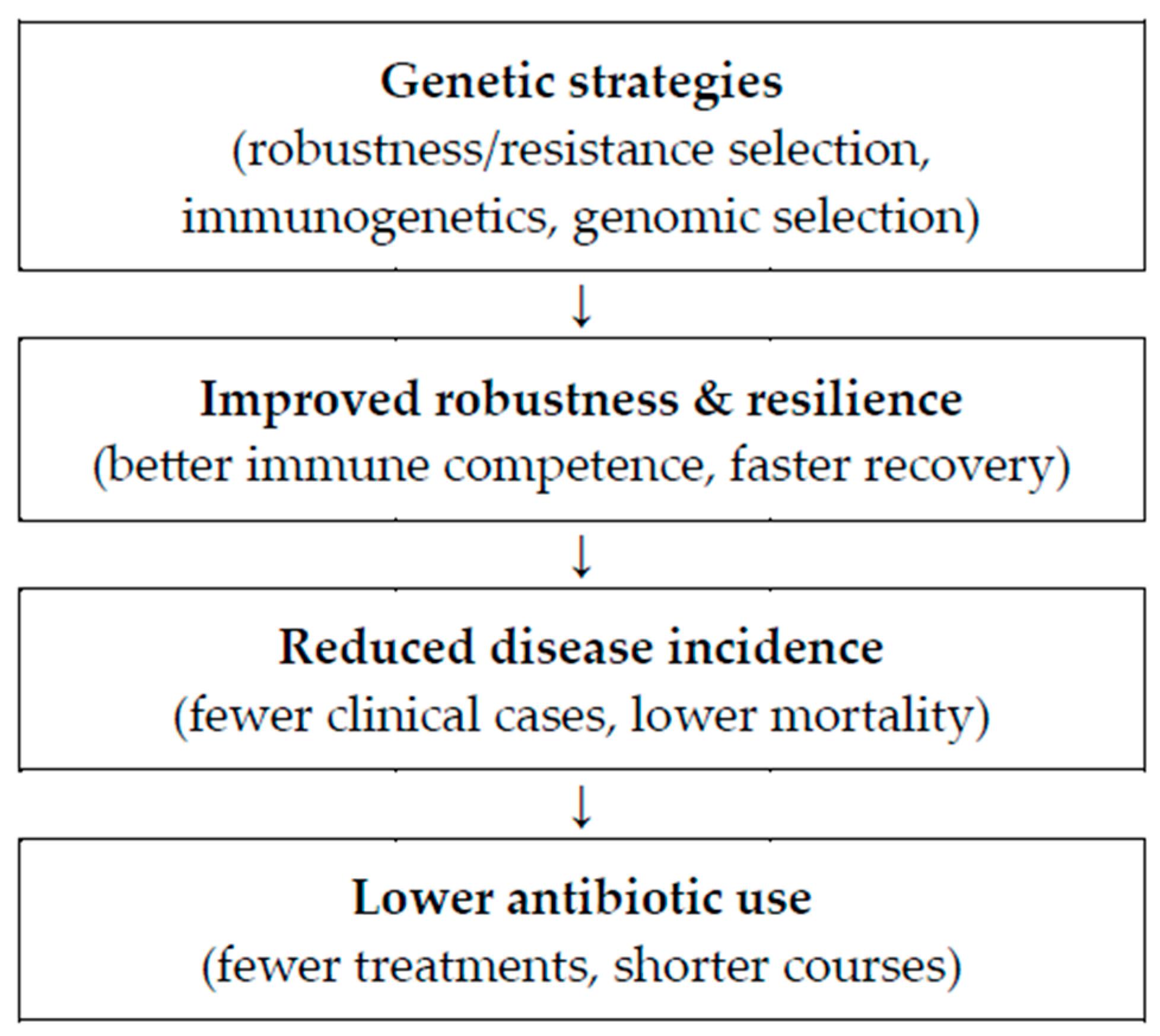 47]. Improving resistance to these diseases can reduce intra-herd variability, culling rates, and mortality, while also lowering the reliance on antibiotics and other pharmaceutical interventions [