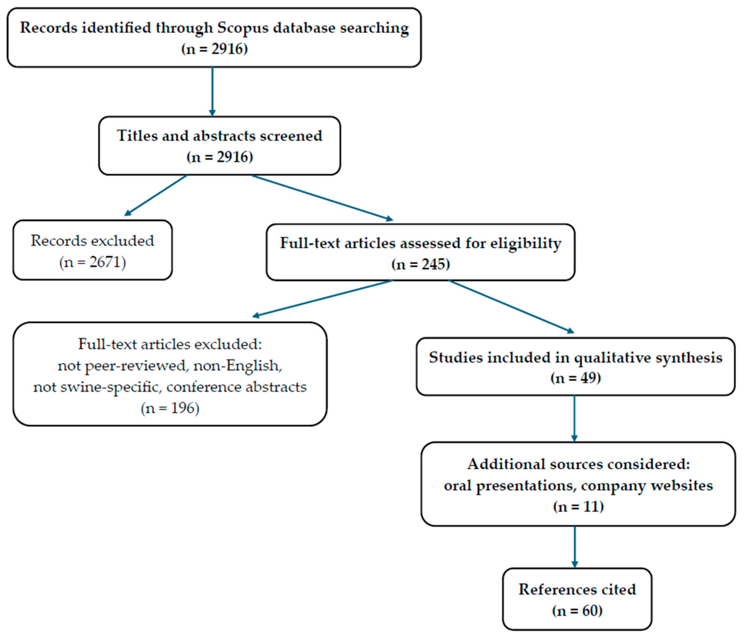 The search initially identified 2916 records. After title and abstract screening, 2671 records were excluded. A total of 245 full-text articles were assessed for eligibility, of which 196 were excluded for not meeting inclusion criteria (e.g., not peer-reviewed, non-English, not swine-specific, or conference abstracts). Ultimately, 49 studies were included in the qualitative synthesis. In addition, 11 relevant and recent supplementary sources (e.g., oral presentations at scientific meetings and symposia, as well as information retrieved from major swine breeding companies’ websites) were considered. The selection process is summarized in