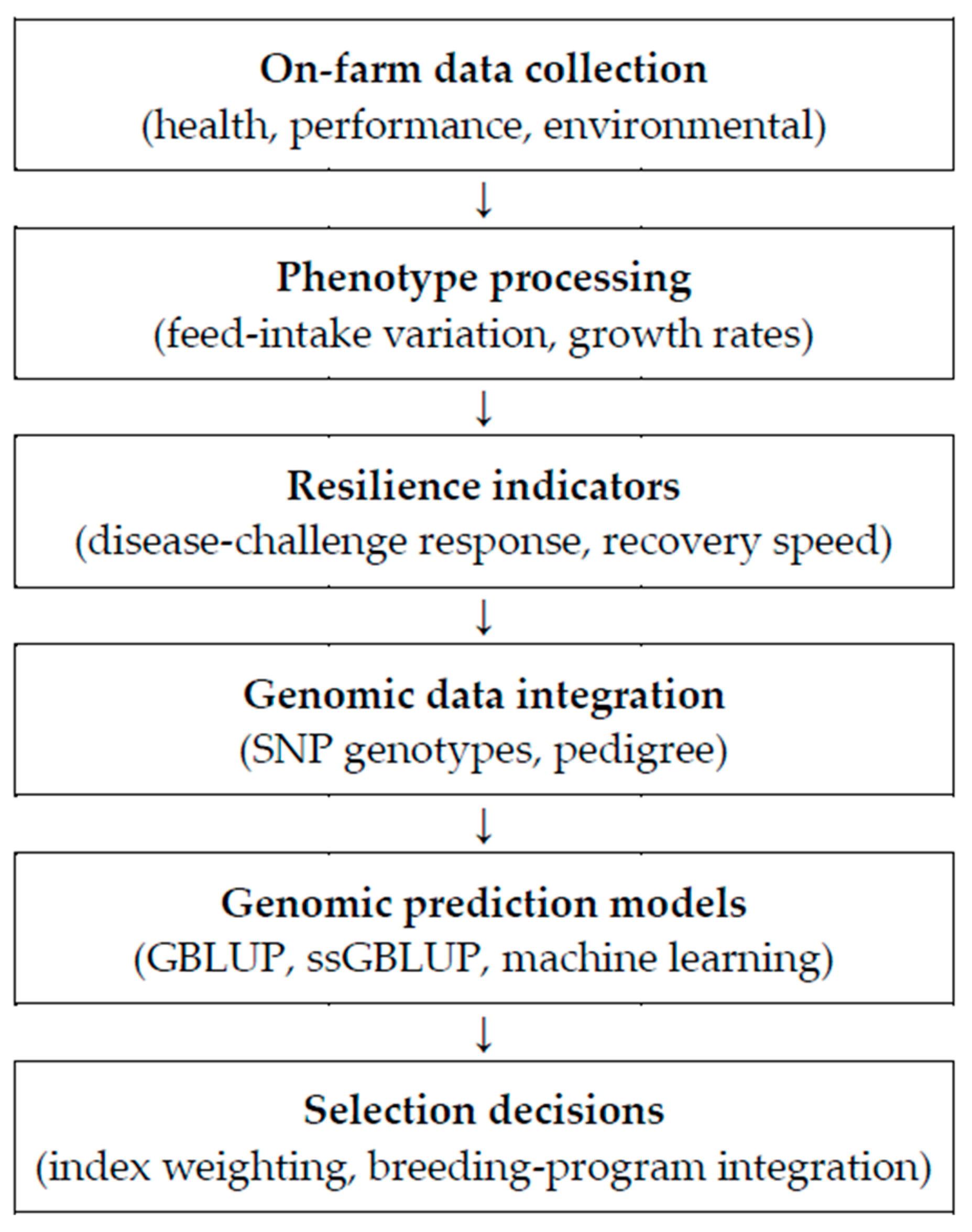 Advances in livestock breeding increasingly integrate genomic and phenotypic information to enhance resilience and productivity. This framework begins with comprehensive on-farm data collection (health, performance, and environmental variables). Processed phenotypes (e.g., feed-intake variation, growth rate) are complemented by resilience indicators (e.g., response to disease challenge, recovery speed). Genomic information from SNP genotyping and pedigree data is then incorporated into prediction models—genomic BLUP (GBLUP), single-step GBLUP (ssGBLUP), and machine-learning approaches—to generate accurate estimates of genetic merit and to inform index weighting and breeding program integration [