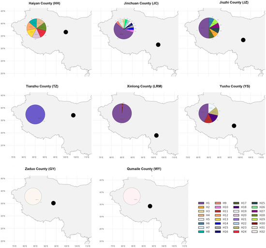 Spatial distribution of 32 Y-chromosome SRY haplotypes in eight Qinghai yak populations. Pie charts are centered on sampling counties (HH = Haiyan, JC = Jinchuan, JZ = Jiuzhi, TZ = Tianzhu, LRM = Larima/Xinlong, YS = Yushu, GY = Zaduo, WY = Qumalai). Slice area is proportional to haplotype frequency; colors match the legend (H1–H32). Single-color pies (TZ, GY, WY) indicate populations represented by one public reference sequence only. The black dots show the location of each county in the region.