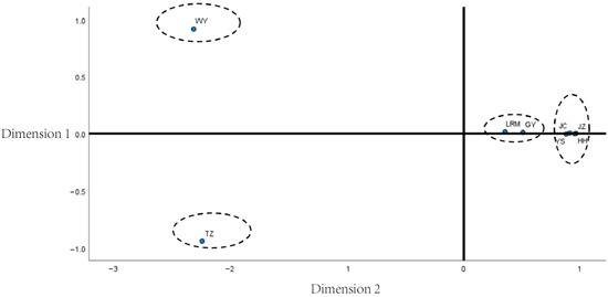 Multidimensional scaling (MDS) plot derived from pairwise F_ST values among eight yak populations. Points represent population centroids; 95% confidence ellipses illustrate dispersion. The configuration resolves four clearly separated clusters, with Wild (WY) and Tianzhu White (TZ) forming the most divergent group.