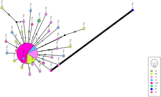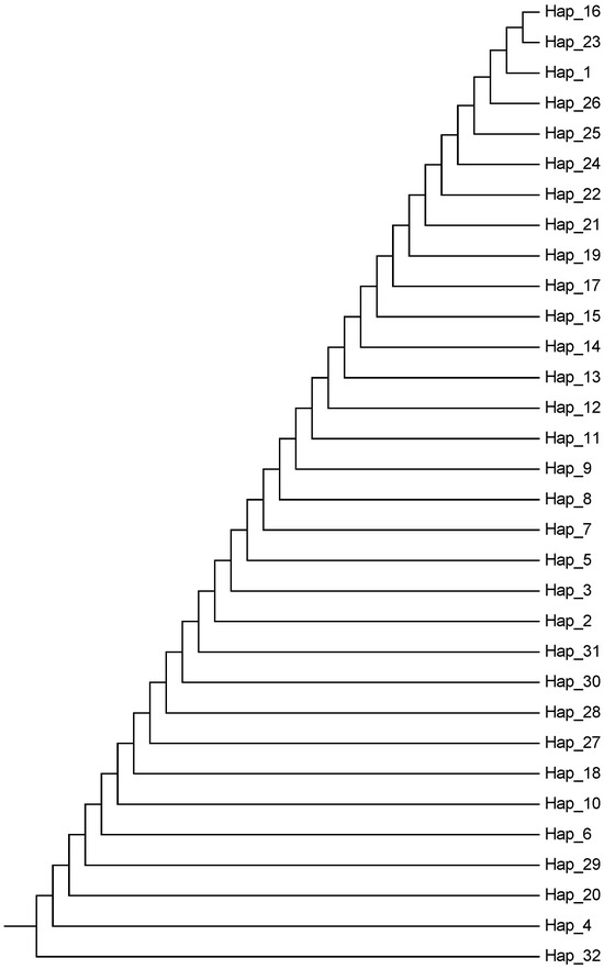 According to our findings, only a few yak breeds (populations) share precisely the same haplotype composition, while most breeds (populations) have specific differences in haplotype composition. Among all the breeds (populations), only Tianzhu White Yak and Qinghai Plateau Yak have the same haplotype composition. Both Tianzhu White Yak and Qinghai Plateau Yak have only one haplotype, namely H21. In addition, the haplotype compositions of other yak breeds (populations) are not entirely the same. Additionally, the frequencies of different haplotypes within each yak breed (population) also vary. For example, in the Huanhu Yak, seven haplotypes were detected, namely H4, H8, H12, H13, H20, H24, and H28, all occurring at similar frequencies; in the Jinchuan Yak, twelve haplotypes were detected, namely H1, H3, H7, H9, H10, H14, H15, H16, H19, H22, H26, and H31, with H1 having the highest frequency and the rest having consistent frequencies; Jiuzhi Yak has H1, H2, H6, H17, H25, H27, and H29, with H1 having the highest frequency; Larima Yak has two haplotypes, namely H1 and H30, with H1 having the highest frequency; Yushu Yak has five haplotypes, namely H1, H5, H11, H18, and H23, with H1 having the highest frequency followed closely by H5, while the remaining three show similar frequencies (Figure 1).