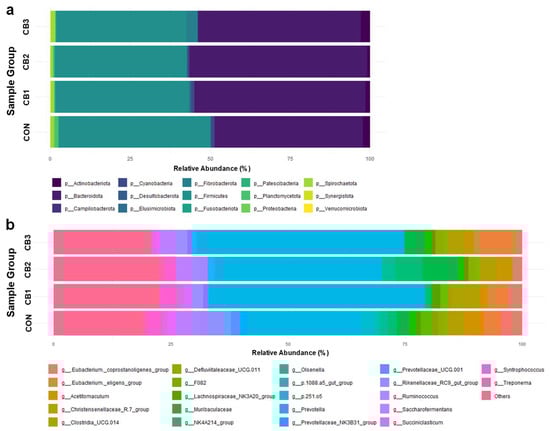 Effects of C. butyricum on the rumen microbiota composition in Hanwoo calves. CON = control group (no supplementation, n = 3); CB1 = C. butyricum 108 CFU (n = 3); CB2 = C. butyricum 109 CFU (n = 3); CB3 = C. butyricum 1010 CFU (n = 3). The relative abundances of (a) group average of phyla and (b) the group average of genera are visualized. Genera with a relative abundance in the bottom 20% and phyla with a relative abundance below 1% were grouped under “Others”.