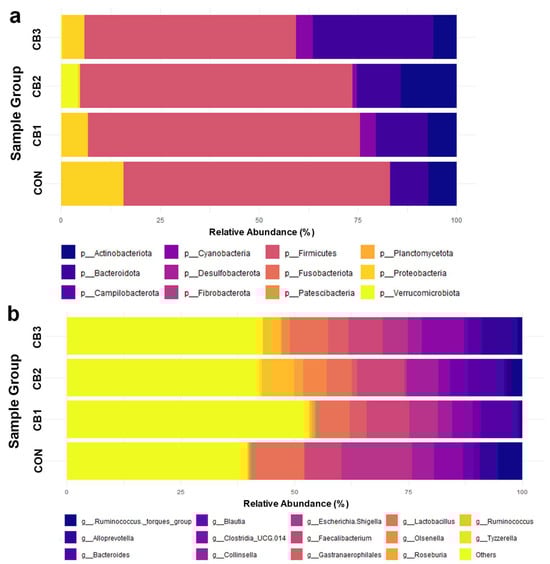 Effects of C. butyricum on fecal microbiota composition in Hanwoo calves. CON = control group (no supplementation, n = 3); CB1 = C. butyricum 108 CFU (n = 3); CB2 = C. butyricum 109 CFU (n = 3); CB3 = C. butyricum 1010 CFU (n = 3). The relative abundances of (a) the group average of phyla and (b) the group average of genera are visualized. Genera with a relative abundance in the bottom 20% and phyla with a relative abundance below 1% were grouped under “Others”.