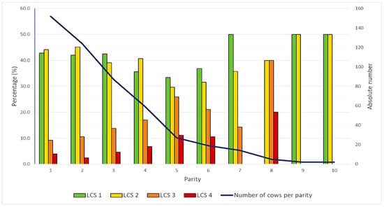 Mean parity was 2.7 (SD: 1.8; median: 2.0; min. 1.0; max. 10.0). Most of the cows were in their first (n = 152; 31.0%) or second lactation (n = 124; 25.3%). The number of cows decreased with increasing parity. A shift in the distribution of the individual LCSs was also observed with increasing parity. In the first three lactations cows mainly had an LCS 1 (41.9%–42.8%) or 2 (39.1%–45.2%). However, the proportion of animals with an LCS of 3 and 4 increased steadily until the fifth and sixth lactations (Figure 1).