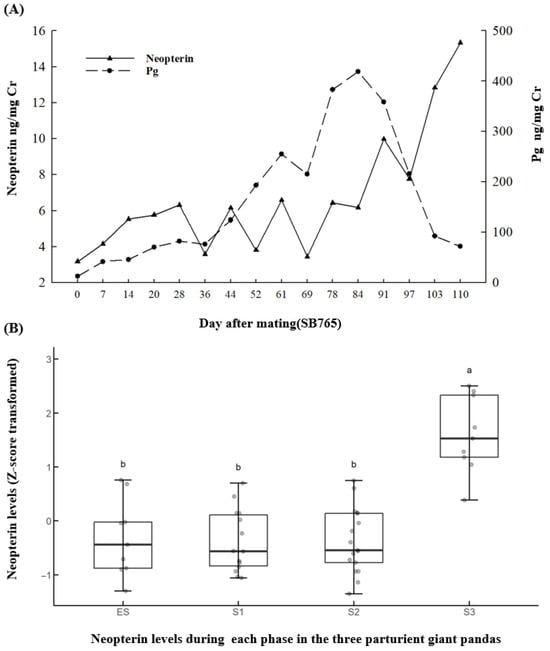 Representative pregnancy figures of: (A) temporal urinary neopterin and Pg profiles from the day of mating through to the period when Pg drops from its peak to approximately 100 ng/mg Cr (SB765); and (B) urinary neopterin levels during each phase in the three parturient giant pandas. Differences between the phases labeled with different letters were statistically significant (p < 0.05).