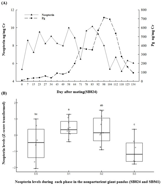 The changes in neopterin levels at each phase were analyzed using these three parturient giant pandas. The results showed that the neopterin in S3 (10.15 ± 0.87 ng/mg Cr; n = 9) were significantly greater (F3,45 = 15.63, p = 0.001) than those in Es (5.59 ± 0.57 ng/mg Cr; n = 9), S1 (5.28 ± 0.39 ng/mg Cr; n = 14), and S2 (5.33 ± 0.46 ng/mg Cr; n = 17), with no differences (p > 0.05) among Es, S1, and S2. The data were transformed using the z-score method and plotted as shown in Figure 1B. This suggests that in the S3 phase of parturient giant pandas, the sharp decline of Pg from its peak is associated with a significant increase in neopterin levels.
