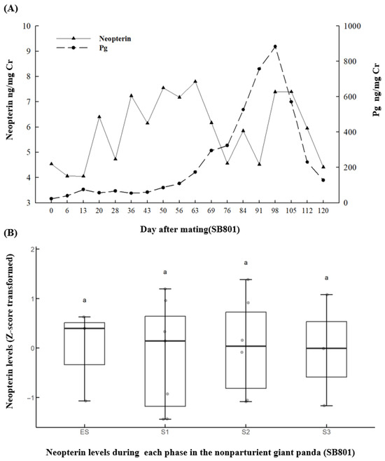 Another type is observed in SB801: From the day of mating to the Pg peak, the pattern of Pg was not similar to that of neopterin (r = 0.06; p = 0.84). During the period when Pg drops from its peak to approximately 100 ng/mg Cr, neopterin remains elevated both at the time of the Pg peak and for one week thereafter, with a decrease only beginning one week after the peak (Figure 3A). However, Pg and neopterin levels showed no correlation during this period (r = 0.943; p = 0.056). For giant panda SB801, no significant differences in neopterin levels were found among Es (5.94 ± 0.70 ng/mg Cr; n = 3), S1 (5.74 ± 0.55 ng/mg Cr; n = 7), S2 (6.01 ± 1.34 ng/mg Cr; n = 6), and S3 (6.28 ± 0.7 ng/mg Cr; n = 3) (Figure 3B; F3,16 = 0.136, p = 0.937). The data were transformed using the z-score method and plotted as shown in Figure 3B.