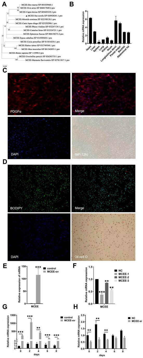 Analysis of MCEE expression patterns. (A) Phylogenetic tree of MCEE. The branch marked with a black triangle represents the pig breed (Sus scrofa). (B) Tissue expression profile of MCEE. (C) PDGFα immunofluorescence staining in isolated porcine intramuscular preadipocytes following differentiation induction. (D) Assessment of lipid droplet formation in differentiated preadipocytes using BODIPY and Oil Red O staining. (E) Quantitative detection of MCEE mRNA expression levels upon overexpression. (F) Quantitative detection of MCEE mRNA expression levels upon knockdown (G) Temporal analysis of MCEE mRNA expression during adipogenic differentiation following MCEE overexpression. (H) Temporal analysis of MCEE mRNA expression during adipogenic differentiation following MCEE knockdown. ** p < 0.01, *** p < 0.001.