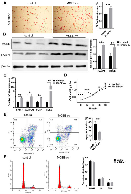 To investigate the effect of MCEE overexpression on the adipogenic differentiation of intramuscular preadipocytes, we transfected cells with the overexpression vector pcDNA3.1-MCEE. After 8 days of adipogenic induction, Oil Red O staining revealed a significant increase in lipid droplet accumulation in the overexpression group compared to control group (Figure 2A). Quantitative analysis at day 2 of adipogenic induction demonstrated elevated FABP4 protein expression in the overexpression group (Figure 2B and Supplementary Material), accompanied by significantly increased mRNA levels of FABP4, ADIPOQ, and PLIN1 (Figure 2C). CCK-8 assays conducted at 0, 12, 24, 36, and 48 h post-induction demonstrated significantly enhanced cell viability in the overexpression group at all timepoints except 24 h (Figure 2D). Flow cytometry analysis revealed both reduced apoptosis rates (Figure 2E) and increased G2/M phase cell populations (Figure 2F) in MCEE-overexpressing cells. These findings demonstrate that overexpression MCEE promotes proliferation and adipogenic differentiation of intramuscular preadipocytes.