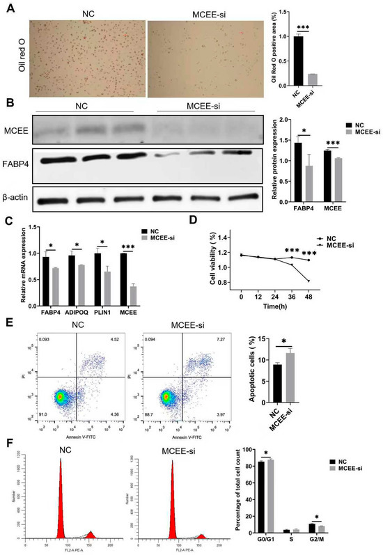To investigate the effects of MCEE knockdown on adipogenic differentiation of intramuscular preadipocytes, we transfected MCEE siRNA into intramuscular adipocytes. Following 8 days of adipogenic induction, Oil Red O staining revealed that MCEE suppression significantly reduced lipid droplet accumulation compared with the control group (Figure 3A). Quantitative analysis conducted on day 2 of adipogenic induction demonstrated a marked decrease in FABP4 protein expression levels in the knockdown group (Figure 3B and Supplementary Material), along with significantly reduced mRNA expression of FABP4, ADIPOQ, and PLIN1 (Figure 3C). CCK-8 assays performed at 0, 12, 24, 36, and 48 h post-induction indicated that cell viability was significantly lower in the MCEE knockdown group at 36 and 48 h (Figure 3D). Flow cytometry analysis showed that the apoptosis rate was significantly increased in the MCEE knockdown group compared with control group (Figure 3E), while the proportion of G2/M-phase cells was notably reduced (Figure 3F). These results suggest that MCEE inhibition suppresses both proliferation and adipogenic differentiation of porcine intramuscular preadipocytes.