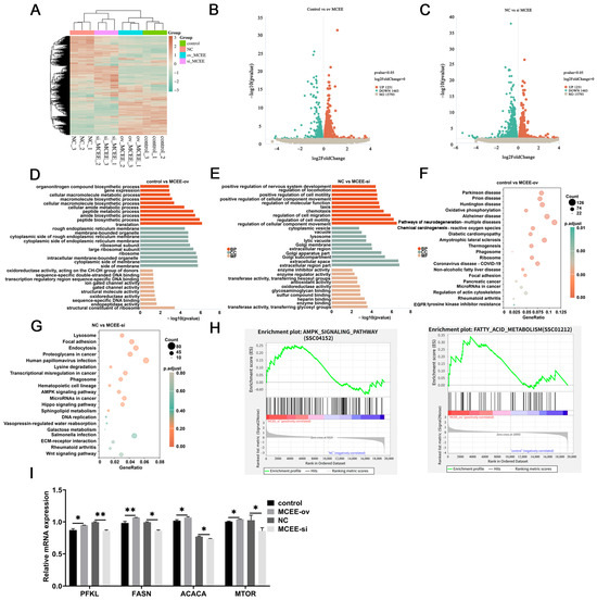 Effects of MCEE expression alteration on the transcriptome of intramuscular preadipocytes. (A) Heatmap displaying DEGs. (B,C) Volcano plots illustrating the distribution of DEGs. (D,E) GO enrichment analysis of DEGs. (F,G) KEGG pathway enrichment analysis of DEGs. (H) The GSEA plots of the fatty acid biosynthesis pathway under MCEE gene overexpression and the AMPK signaling pathway under MCEE gene inhibition. (I) qRT-PCR validation of DEGs. * p < 0.05, ** p < 0.01.