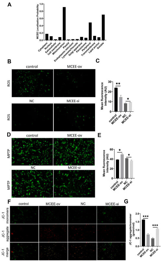 Effects of Altered MCEE Expression on Mitochondrial Functions. (A) Prediction of MCEE subcellular localization. (B) Measurement of intracellular ROS levels. (C) Quantification of data shown in (B). (D) mitochondrial permeability transition pore (mPTP) assay, where green fluorescence intensity inversely correlates with mPTP opening. (E) Quantification of data shown in (D). (F) JC-1 fluorescent probe assay for mitochondrial membrane potential. (G) Quantification of data shown in (F). * p < 0.05, ** p < 0.01, *** p < 0.001.