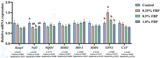 3.4. Effects of FBP on Oxidative-Status-Related Gene Expressions of Spent Hens