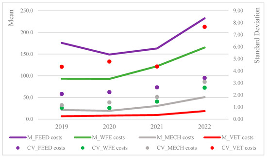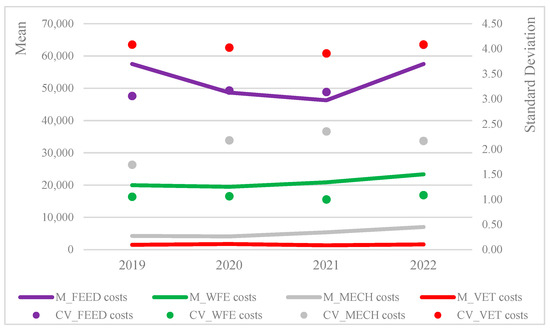Figure 1 reports the mean values and the standard deviations of costs by year, as well as cost categories, showing the relevance of feed costs, their increase in the last year, and a high standard deviation. The other cost categories reported slight increases in their absolute amounts, and veterinary costs show the highest variability in each year of observation. As emphasized by [41], in the observed period, the repercussions of the pandemic and the resultant protracted lockdown had substantial impacts on the livestock sector, including the poultry production system and associated value chains, nutrition, and healthcare costs.