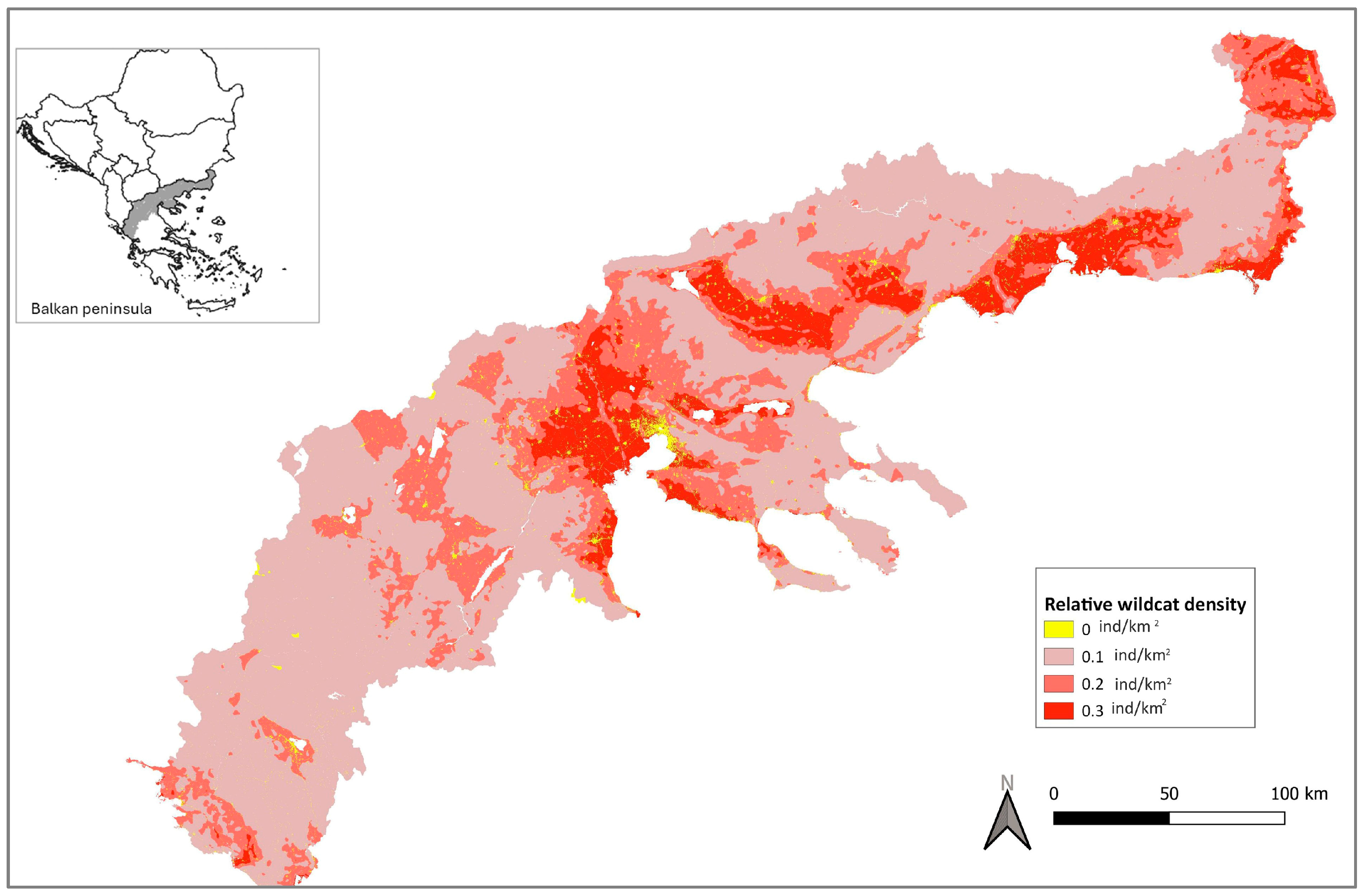 Migli, D.; Astaras, C.; Kiamos, N.; Kyriakidis, S.; Mertzanis, Y.; Boutsis, G.; Oikonomakis, N.; Tsaknakis, Y.; Youlatos, D. Habitat Suitability and Relative Abundance of the European Wildcat (Felis silvestris) in the Southeastern Part of Its Range. Animals 2025, 15, 2816. https://doi.org/10.3390/ani15192816
