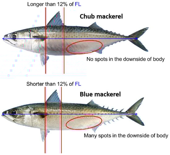 Morphological differences between chub mackerel (Scomber japonicus) and blue mackerel (Scomber australasicus) (The image is provided by the NPFC Technical Working Group on Chub Mackerel Stock Assessment; FL means fork length).