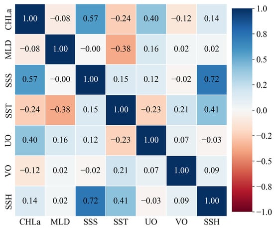 To prevent multicollinearity from affecting the stability of the model, a Pearson correlation test was performed on the seven candidate environmental variables (Figure 2). According to standard statistical criteria, a Pearson correlation coefficient (r) with an absolute value below 0.7 (|r| < 0.7) is generally considered to indicate a lack of significant correlation between variables [27]. In our analysis, the correlation coefficient between SSS and SSH was 0.72, demonstrating a significant positive correlation. Considering the critical role of SSS in differentiating the ecological niches of Blue Mackerel and Chub Mackerel [19], SSH was excluded, and the final set of input variables for the model included SST, UO, VO, Chla, MLD, and SSS. This variable selection strategy effectively reduced dimensional redundancy and ensured the relative independence among the environmental factors, thereby providing a robust foundation for the subsequent ZOIBM.