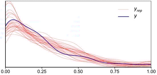 Posterior predictive checks were used to verify the consistency between the model’s assumptions and the data-generating process. A total of 100 simulated datasets (yrep) were randomly drawn from the model’s posterior distribution and compared against the observed data (y) to assess their distributional overlap. If the model’s assumptions are valid, the yrep datasets should be able to replicate the key statistical features of y (e.g., distribution of extreme values, fluctuation patterns, and quantile characteristics). Significant distributional discrepancies would suggest potential structural misspecification or inadequate assumptions in the model [33,34].