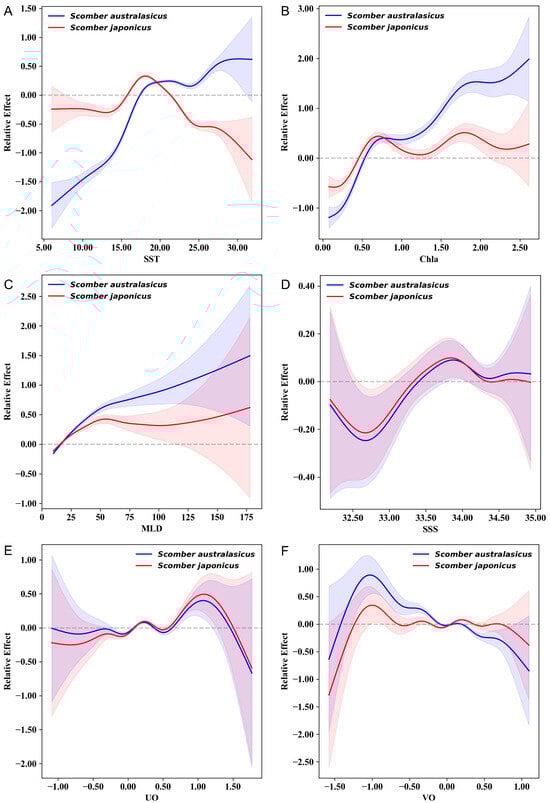 Relationships between environmental factors and the relative abundance of two mackerel species. (A) SST, (B) Chla, (C) MLD, (D) SSS, (E) VO, (F) UO. Blue and red lines (with shaded confidence intervals) represent Blue Mackerel (Scomber australasicus) and Chub Mackerel (Scomber japonicus), respectively.