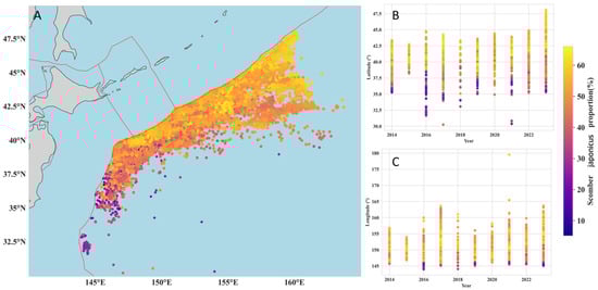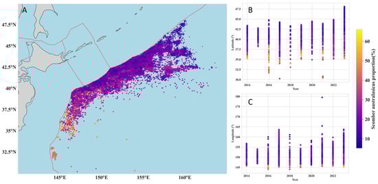 Spatiotemporal distribution of the proportion of Blue Mackerel (Scomber australasicus) in total catch from 2014 to 2023. (A) Geographic distribution of catch proportions. The red lines indicate the boundaries of the Exclusive Economic Zone (EEZ). (B) Proportional distribution by latitude and year. (C) Proportional distribution by longitude and year.